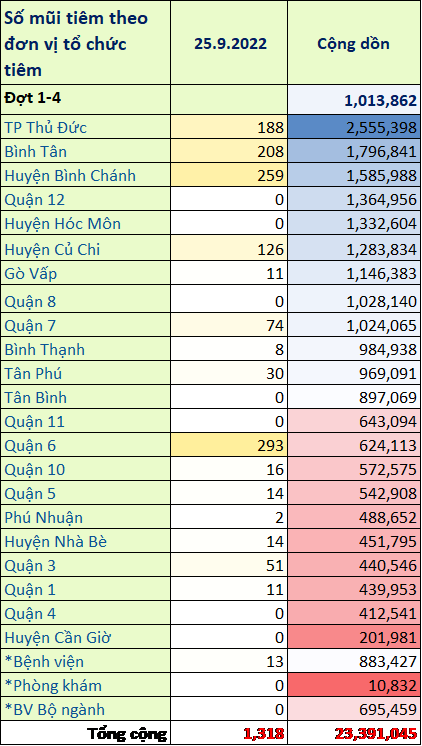 TP. Hồ Chí Minh: Cập nhật số liệu tiêm chủng vắc xin phòng chống COVID-19 ngày 25/9/2022