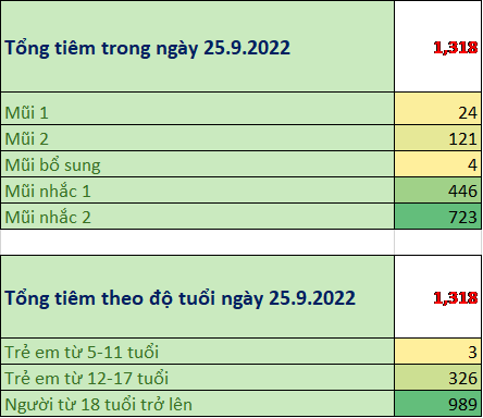 Trong ngày 25/9/2022: toàn thành phố đã tiêm được 1.318 mũi tiêm, bao gồm 24 mũi 1 (2%); 121 mũi 2 (9%); 4 mũi bổ sung (0,3%); 446 mũi nhắc lần 1 (34%); 723 mũi nhắc lần 2 (55%) tại 36 điểm tiêm. Trong đó: người từ 18 tuổi trở lên đã tiêm được 989 mũi (75%); trẻ từ 12 đến dưới 18 tuổi: đã tiêm được 326 mũi (25%); trẻ từ 05 đến dưới 12 tuổi: đã tiêm được 3 mũi (0,2%).
