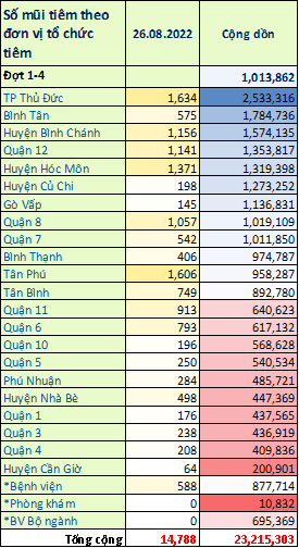 Trong ngày 26/08/2022: toàn thành phố đã tiêm được 14.788 mũi tiêm, bao gồm 3.083 mũi 1 (21%); 1.820 mũi 2 (13%); 51 mũi bổ sung (0,3%); 4.219 mũi nhắc lần 1 (28%); 5.615 mũi nhắc lần 2 (38%) tại 190 điểm tiêm, 203 bàn tiêm tại 22/22 quận/huyện/thành phố, hoãn tiêm 45 trường hợp, 0 trường hợp chuyển bệnh viện tiêm. Trong đó: người từ 18 tuổi trở lên đã tiêm được 7.189 mũi (49%); trẻ từ 12 đến dưới 18 tuổi: đã tiêm được 3.381 mũi (23%); trẻ từ 05 đến dưới 12 tuổi: đã tiêm được 4.218 mũi (28%).