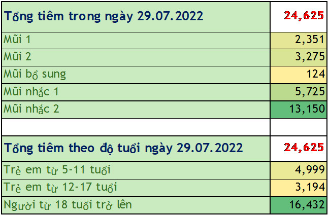 Trong ngày 29/07/2022: toàn thành phố đã tiêm được 24.625 mũi tiêm, bao gồm 2.351 mũi 1 (9%); 3.275 mũi 2 (14%); 124 mũi bổ sung (0.5%); 5.725 mũi nhắc lần 1 (23%); 13.150 mũi nhắc lần 2 (54%) tại 167 điểm tiêm, 233 bàn tiêm. Trong đó, người từ 18 tuổi trở lên: đã tiêm được 16.432 mũi (67%), trẻ từ 12 đến dưới 18 tuổi: đã tiêm được 3.194 mũi (13%), trẻ từ 05 đến dưới 12 tuổi: đã tiêm được 4.999 mũi (20%)