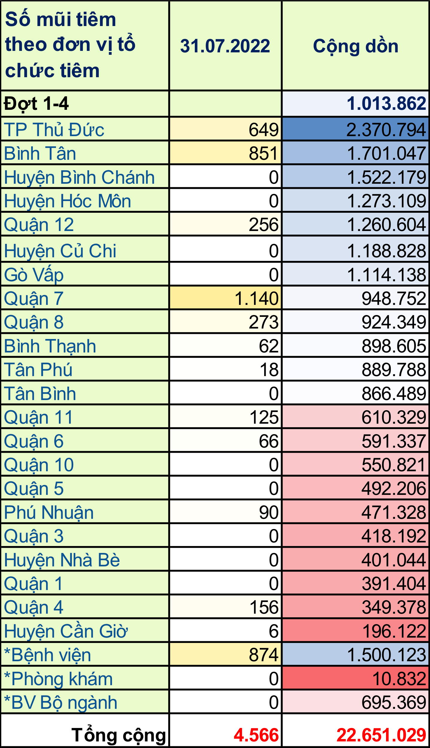 TP. Hồ Chí Minh: Cập nhật số liệu tiêm chủng vắc xin phòng chống COVID-19 ngày 31/7/2022