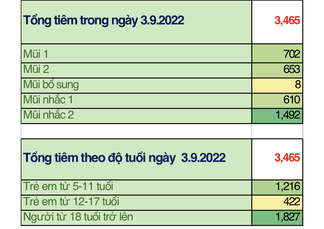 Trong ngày 3/9/2022: toàn thành phố đã tiêm được 3.465 mũi tiêm, bao gồm 702 mũi 1 (20%); 653 mũi 2 (19%); 8 mũi bổ sung (0,2%); 610 mũi nhắc lần 1 (18%); 1.492 mũi nhắc lần 2 (43%) tại 59 điểm tiêm. Trong đó: người từ 18 tuổi trở lên đã tiêm được 1.827 mũi (53%); trẻ từ 12 đến dưới 18 tuổi: đã tiêm được 422 mũi (12%); trẻ từ 05 đến dưới 12 tuổi: đã tiêm được 1.216 mũi (35%).