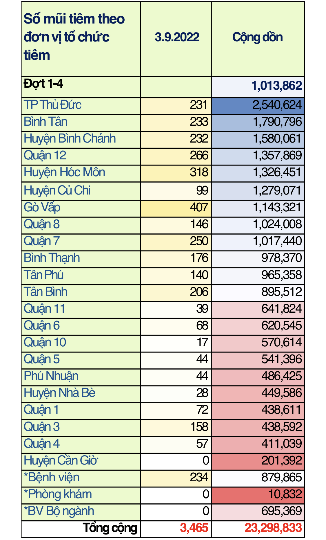 TP. Hồ Chí Minh: Cập nhật số liệu tiêm chủng vắc xin phòng chống COVID-19 ngày 3/9/2022