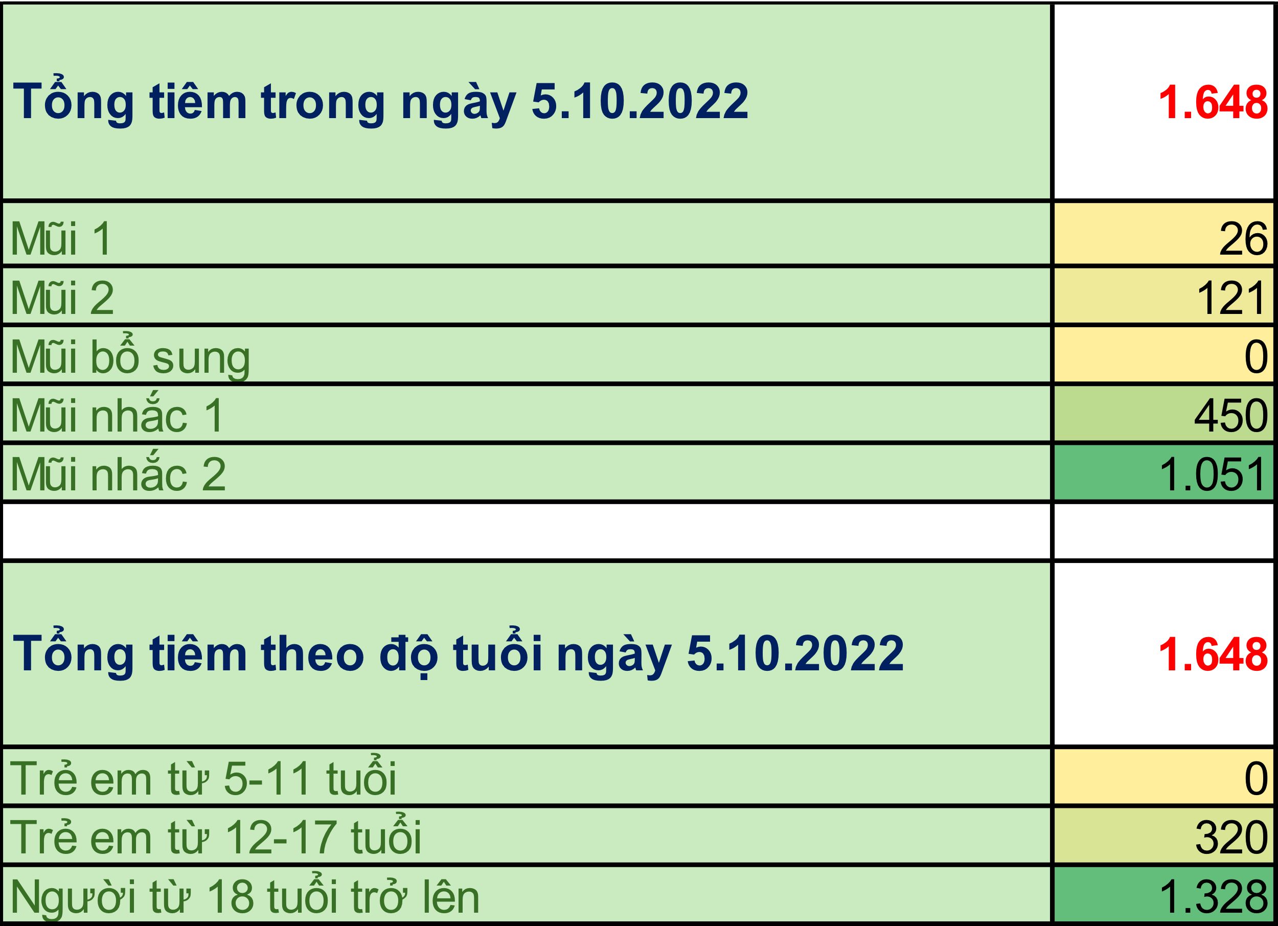 Trong ngày 5/10/2022, toàn thành phố đã tiêm được 1.648 mũi tiêm, bao gồm 26 mũi 1 (2%); 121 mũi 2 (7%); 0 mũi bổ sung (0%); 450 mũi nhắc lần 1 (27%); 1.051 mũi nhắc lần 2 (64%) tại 91 điểm tiêm. Trong đó: người từ 18 tuổi trở lên đã tiêm được 1.328 mũi (81%); trẻ từ 12 đến dưới 18 tuổi: đã tiêm được 320 mũi (19%); trẻ từ 05 đến dưới 12 tuổi: đã tiêm được 0 mũi (0%).