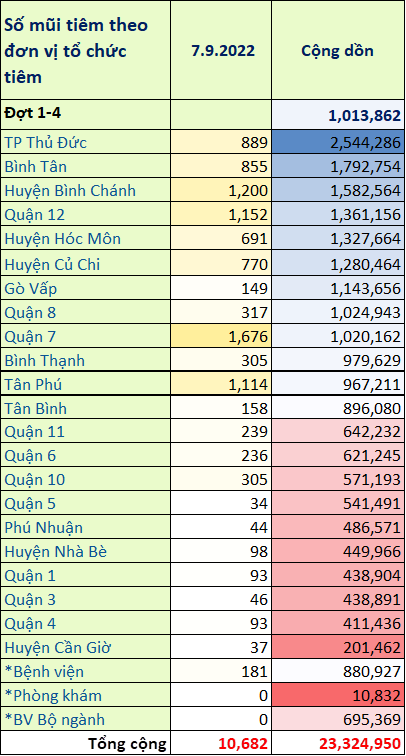 TP. Hồ Chí Minh: Cập nhật số liệu tiêm chủng vắc xin phòng chống COVID-19 ngày 7/9/2022