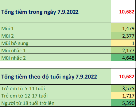 Trong ngày 7/9/2022: toàn thành phố đã tiêm được 10.682 mũi tiêm, bao gồm 1.479 mũi 1 (14%); 2.377 mũi 2 (22%); 1 mũi bổ sung (0,01%); 2.177 mũi nhắc lần 1 (20%); 4.648 mũi nhắc lần 2 (44%) tại 182 điểm tiêm. Trong đó: người từ 18 tuổi trở lên đã tiêm được 5.390 mũi (51%); trẻ từ 12 đến dưới 18 tuổi: đã tiêm được 1.717 mũi (16%); trẻ từ 05 đến dưới 12 tuổi: đã tiêm được 3.575 mũi (33%).