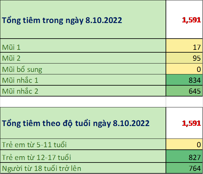 Trong ngày 8/10/2022: toàn thành phố đã tiêm được 1.591 mũi tiêm, bao gồm 17 mũi 1 (1%); 95 mũi 2 (6%); 0 mũi bổ sung (0%); 834 mũi nhắc lần 1 (52%); 645 mũi nhắc lần 2 (41%) tại 40 điểm tiêm. Trong đó: người từ 18 tuổi trở lên đã tiêm được 764 mũi (48%); trẻ từ 12 đến dưới 18 tuổi: đã tiêm được 827 mũi (52%); trẻ từ 05 đến dưới 12 tuổi: đã tiêm được 0 mũi (0%).