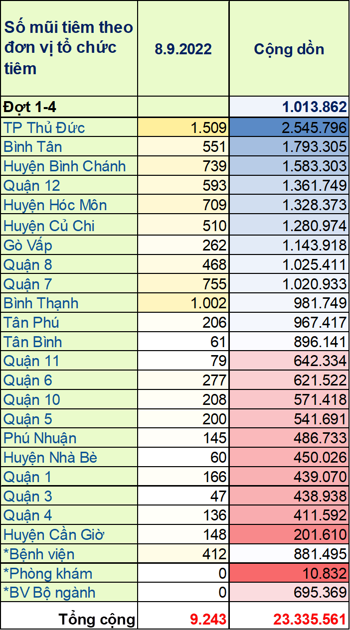 Tính đến hết ngày 8/9/2022, toàn Thành phố đã tiêm được 23.335.561 mũi (bao gồm 8.676.387 mũi 1; 7.718.941 mũi 2; 689.464 mũi bổ sung; 4.772.785 mũi nhắc lần 1; 1.477.984 mũi nhắc lần 2).