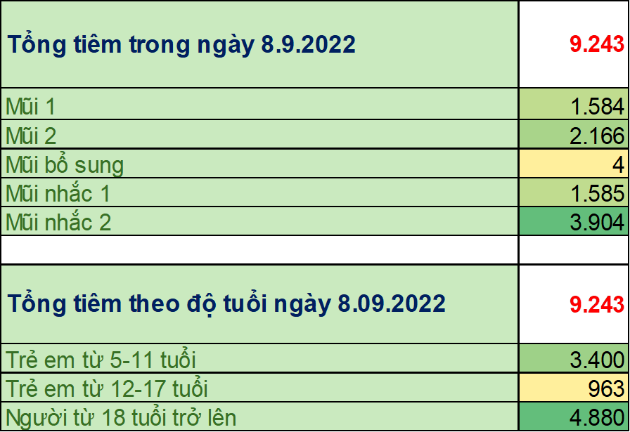 Trong ngày 8/9/2022, toàn thành phố đã tiêm được 9.243 mũi tiêm, bao gồm 1.584 mũi 1 (17%); 2.166 mũi 2 (24gn vgv%); 4 mũi bổ sung (0,04%); 1.585 mũi nhắc lần 1 (17%); 3.904 mũi nhắc lần 2 (42%) tại 160 điểm tiêm. Trong đó: người từ 18 tuổi trở lên đã tiêm được 4.880 mũi (53%); trẻ từ 12 đến dưới 18 tuổi: đã tiêm được 963 mũi (10%); trẻ từ 05 đến dưới 12 tuổi: đã tiêm được 3.400 mũi (37%).