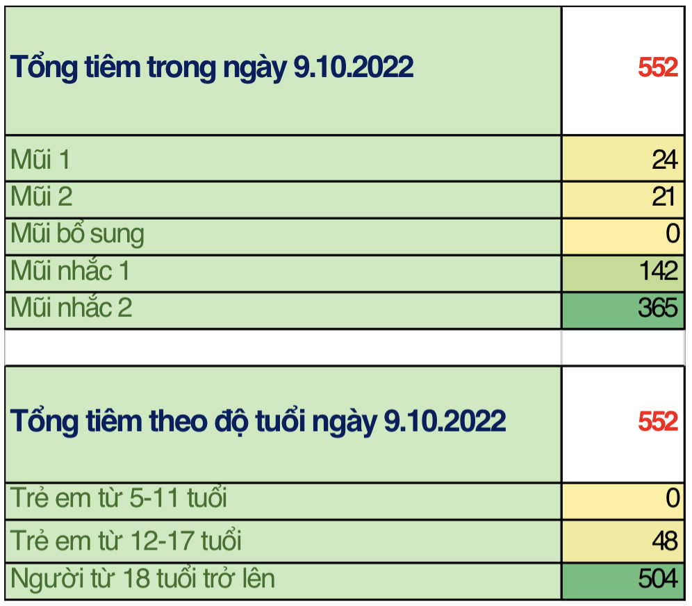 Trong ngày 9/10/2022: toàn thành phố đã tiêm được 552 mũi tiêm, bao gồm 24 mũi 1 (4%); 21 mũi 2 (4%); 0 mũi bổ sung (0%); 142 mũi nhắc lần 1 (26%); 365 mũi nhắc lần 2 (66%) tại 27 điểm tiêm. Trong đó: người từ 18 tuổi trở lên đã tiêm được 504 mũi (91%); trẻ từ 12 đến dưới 18 tuổi: đã tiêm được 48 mũi (9%); trẻ từ 05 đến dưới 12 tuổi: đã tiêm được 0 mũi (0%).