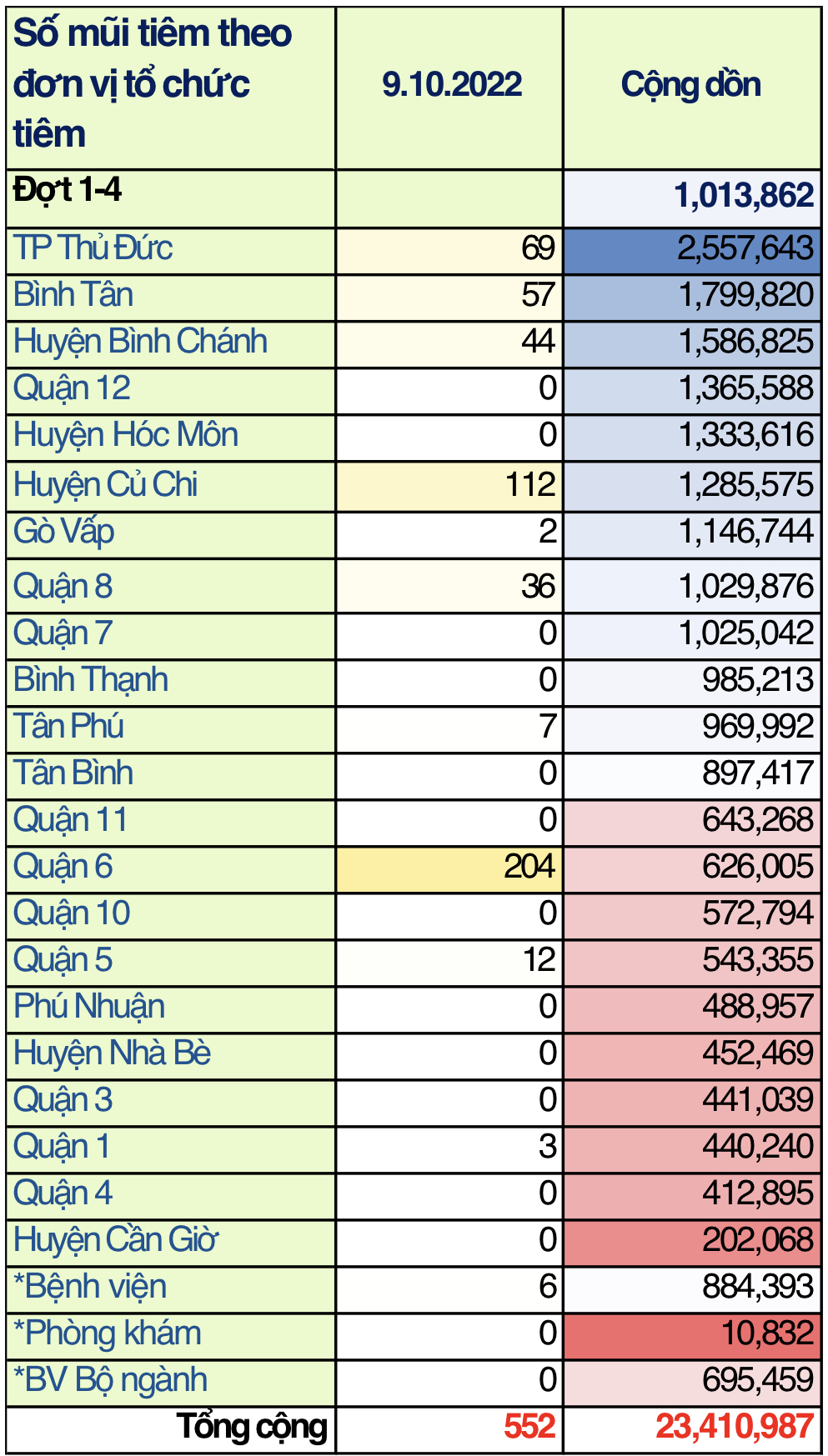 TP. Hồ Chí Minh: Cập nhật số liệu tiêm chủng vắc xin phòng chống COVID-19 ngày 9/10/2022