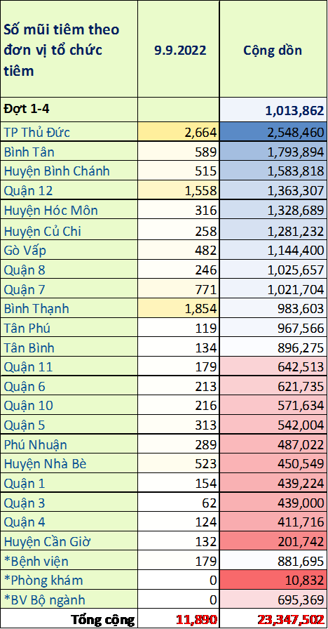 TP. Hồ Chí Minh: Cập nhật số liệu tiêm chủng vắc xin phòng chống COVID-19 ngày 9/9/2022