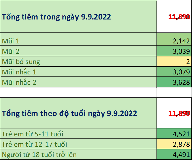 Trong ngày 9/9/2022: toàn thành phố đã tiêm được 11.890 mũi tiêm, bao gồm 2.142 mũi 1 (18%); 3.039 mũi 2 (26%); 2 mũi bổ sung (0,02%); 3.079 mũi nhắc lần 1 (26%); 3.628 mũi nhắc lần 2 (30%) tại 154 điểm tiêm. Trong đó: người từ 18 tuổi trở lên đã tiêm được 4.491 mũi (38%); trẻ từ 12 đến dưới 18 tuổi: đã tiêm được 2.878 mũi (24%); trẻ từ 05 đến dưới 12 tuổi: đã tiêm được 4.521 mũi (38%).
