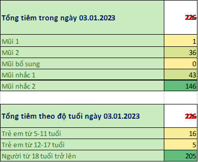 Trong ngày 03/01/2023 toàn thành phố đã tiêm được 226 mũi tiêm, bao gồm 1 mũi 1; 36 mũi 2; 0 mũi bổ sung;43 mũi nhắc lần 1; 146 mũi nhắc lần 2 tại 46 điểm tiêm.Trong đó: người từ 18 tuổi trở lên đã tiêm được 205 mũi (91%); trẻ từ 12 đến dưới 18 tuổi: đã tiêm được 5 mũi (2%); trẻ từ 05 đến dưới 12 tuổi: đã tiêm được 16 mũi (7%).