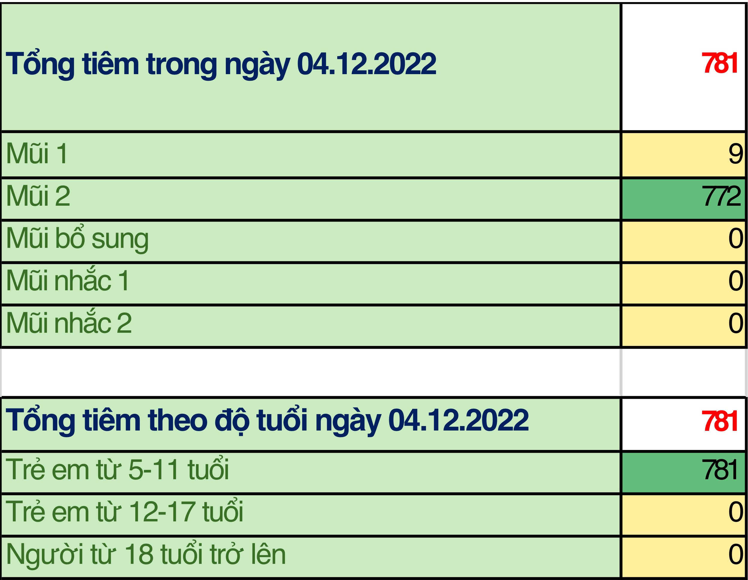 Trong ngày 04/12/2022 toàn thành phố đã tiêm được 781 mũi tiêm, bao gồm 9 mũi 1; 772 mũi 2; 0 mũi bổ sung; 0 mũi nhắc lần 1; 0 mũi nhắc lần 2 tại 14 điểm tiêm. Trong đó: người từ 18 tuổi trở lên đã tiêm được 0 mũi (0%); trẻ từ 12 đến dưới 18 tuổi: đã tiêm được 0 mũi (0%); trẻ từ 05 đến dưới 12 tuổi: đã tiêm được 781 mũi (100%).