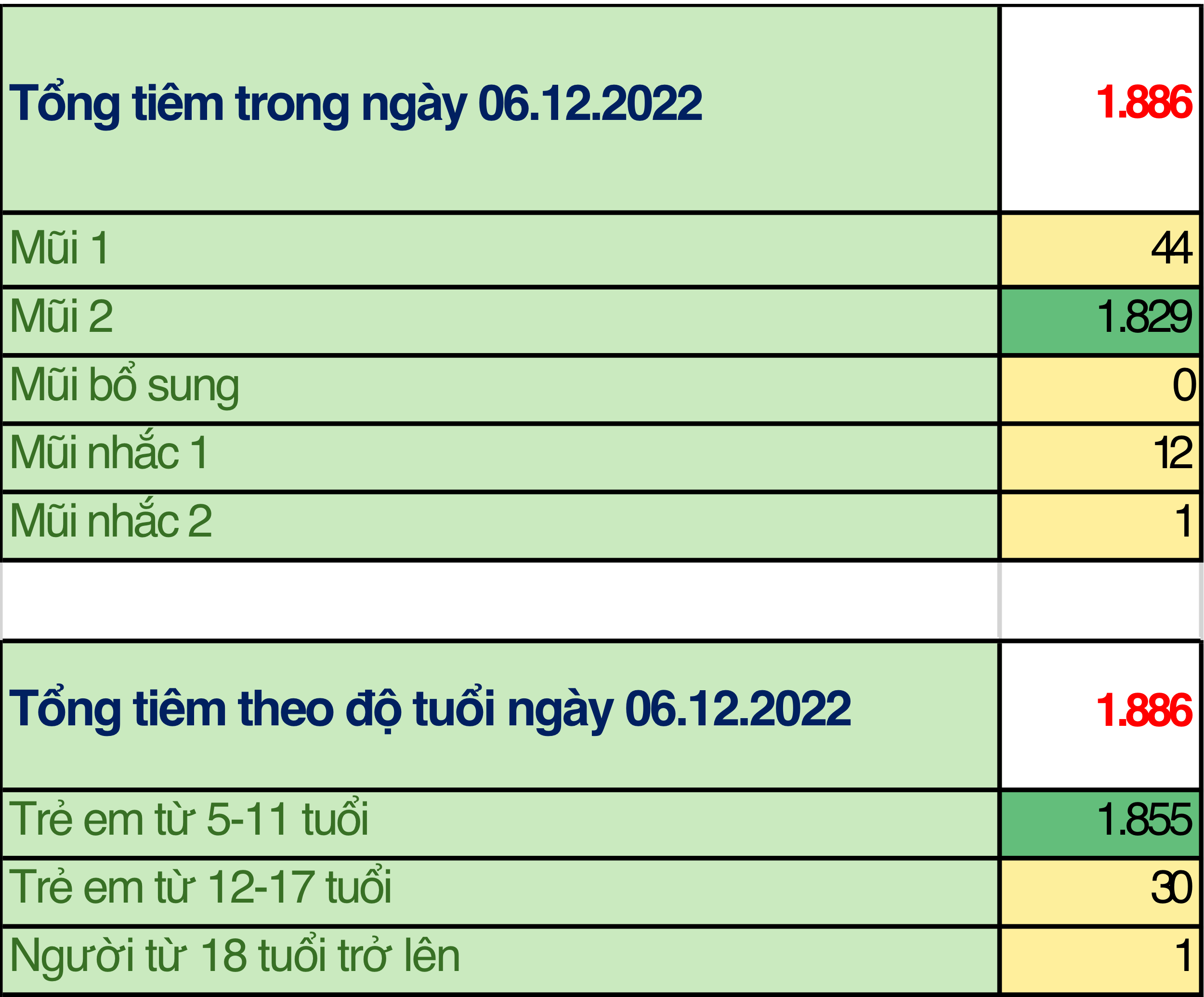 Trong ngày 06/12/2022 toàn thành phố đã tiêm được 1.886 mũi tiêm, bao gồm 26 mũi 44; 1.829 mũi 2; 0 mũi bổ sung; 43 mũi nhắc lần 1; 1 mũi nhắc lần 2 tại 39 điểm tiêm. Trong đó: người từ 18 tuổi trở lên đã tiêm được 1 mũi (0,1%); trẻ từ 12 đến dưới 18 tuổi: đã tiêm được 30 mũi (1,6%); trẻ từ 05 đến dưới 12 tuổi: đã tiêm được 1855 mũi (98,3%).