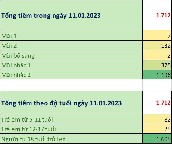 Trong ngày 12/01/2023 toàn thành phố đã tiêm được 1.960 mũi tiêm, bao gồm 14 mũi 1; 119 mũi 2; 3 mũi bổ sung; 340 mũi nhắc lần 1; 1.484 mũi nhắc lần 2 tại 205 điểm tiêm.Trong đó: người từ 18 tuổi trở lên đã tiêm được 1867 mũi (95,3%); trẻ từ 12 đến dưới 18 tuổi: đã tiêm được 4 mũi (0,2%); trẻ từ 05 đến dưới 12 tuổi: đã tiêm được 89 mũi (4,5%).