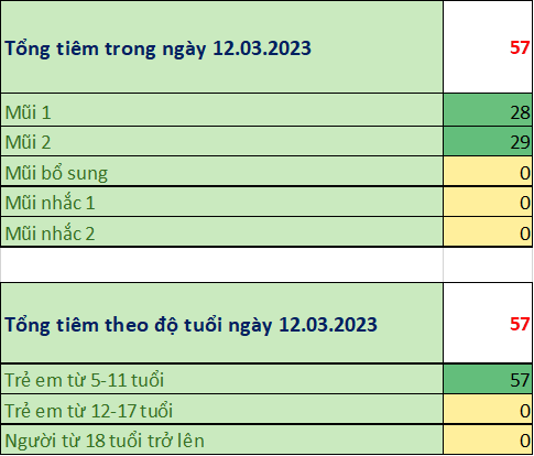 Trong ngày 12/03/2023 toàn thành phố đã tiêm được 57 mũi tiêm, bao gồm 28 mũi 1; 29 mũi 2; 0 mũi bổ sung; 0 mũi nhắc lần 1; 0 mũi nhắc lần 2 tại 8 điểm tiêm.Trong đó: người từ 18 tuổi trở lên đã tiêm được 0 mũi (0%); trẻ từ 12 đến dưới 18 tuổi: đã tiêm được 0 mũi (0%); trẻ từ 05 đến dưới 12 tuổi: đã tiêm được 57 mũi (100%).