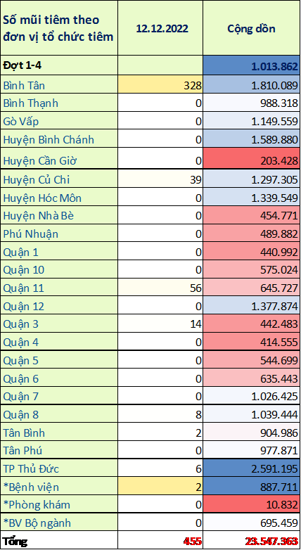 TP. Hồ Chí Minh: Cập nhật số liệu tiêm chủng vắc-xin phòng chống COVID-19 ngày 12/12/2022