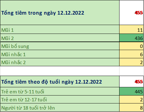 Trong ngày 12/12/2022 toàn thành phố đã tiêm được 455 mũi tiêm, bao gồm 11 mũi 1; 436 mũi 2; 0 mũi bổ sung; 6 mũi nhắc lần 1; 2 mũi nhắc lần 2 tại 17 điểm tiêm. Trong đó: người từ 18 tuổi trở lên đã tiêm được 8 mũi (1,8%); trẻ từ 12 đến dưới 18 tuổi: đã tiêm được 2 mũi (0,4%); trẻ từ 05 đến dưới 12 tuổi: đã tiêm được 445 mũi (97,8%).