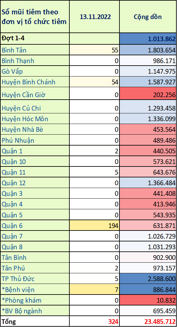 TP. Hồ Chí Minh: Cập nhật số liệu tiêm chủng vắc-xin phòng chống COVID-19 ngày 13/11/2022