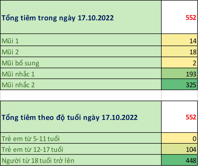 Trong ngày 17/10/2022: toàn thành phố đã tiêm được 552 mũi tiêm, bao gồm 14 mũi 1 (3%); 18 mũi 2 (3%); 2 mũi bổ sung (0,4%); 193 mũi nhắc lần 1 (35%); 325 mũi nhắc lần 2 (59%) tại 21 điểm tiêm. Trong đó: người từ 18 tuổi trở lên đã tiêm được 448 mũi (81%); trẻ từ 12 đến dưới 18 tuổi: đã tiêm được 104 mũi (19%); trẻ từ 05 đến dưới 12 tuổi: đã tiêm được 0 mũi (0%).