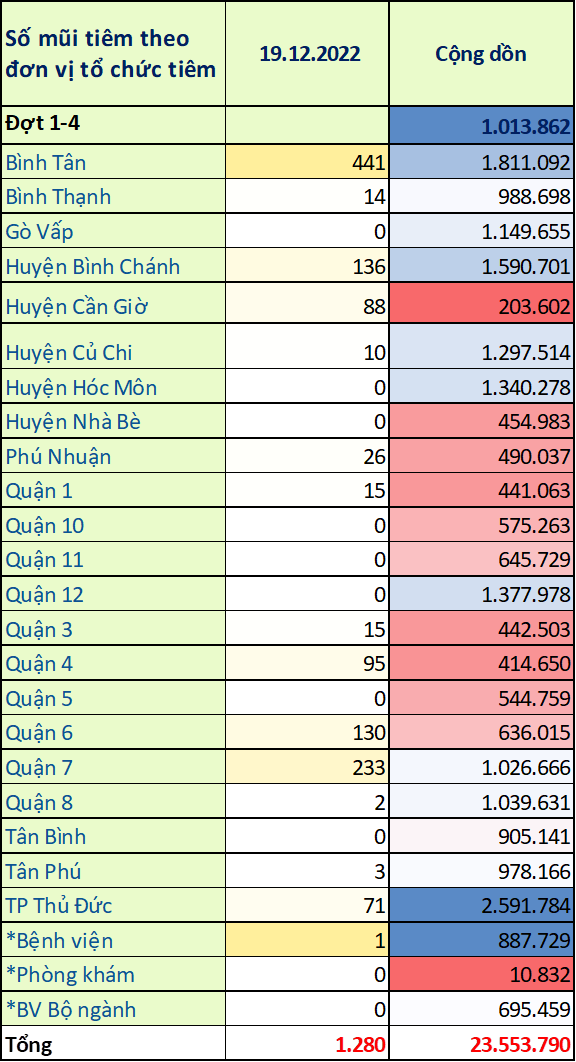 TP. Hồ Chí Minh: Cập nhật số liệu tiêm chủng vắc-xin phòng chống COVID-19 ngày 19/12/2022