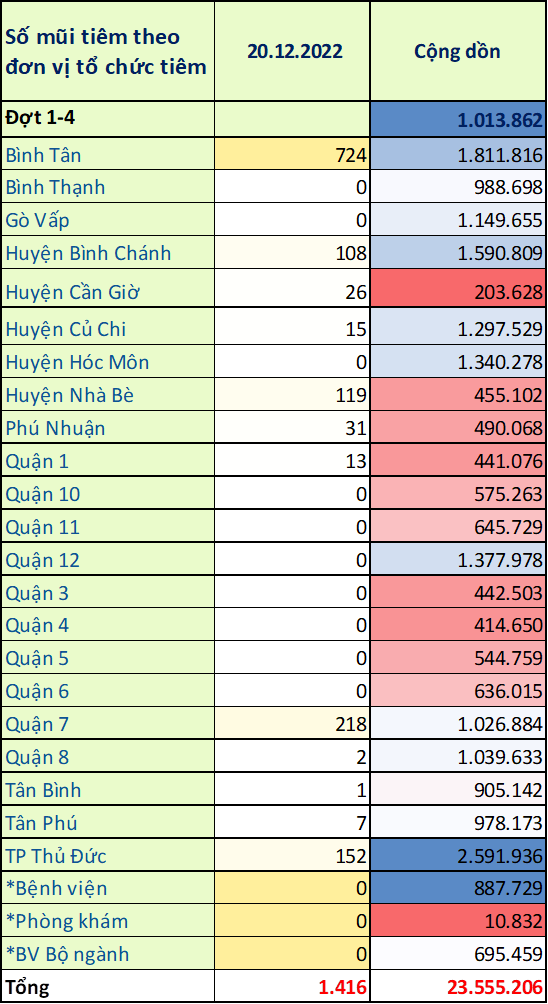 TP. Hồ Chí Minh: Cập nhật số liệu tiêm chủng vắc-xin phòng chống COVID-19 ngày 20/12/2022