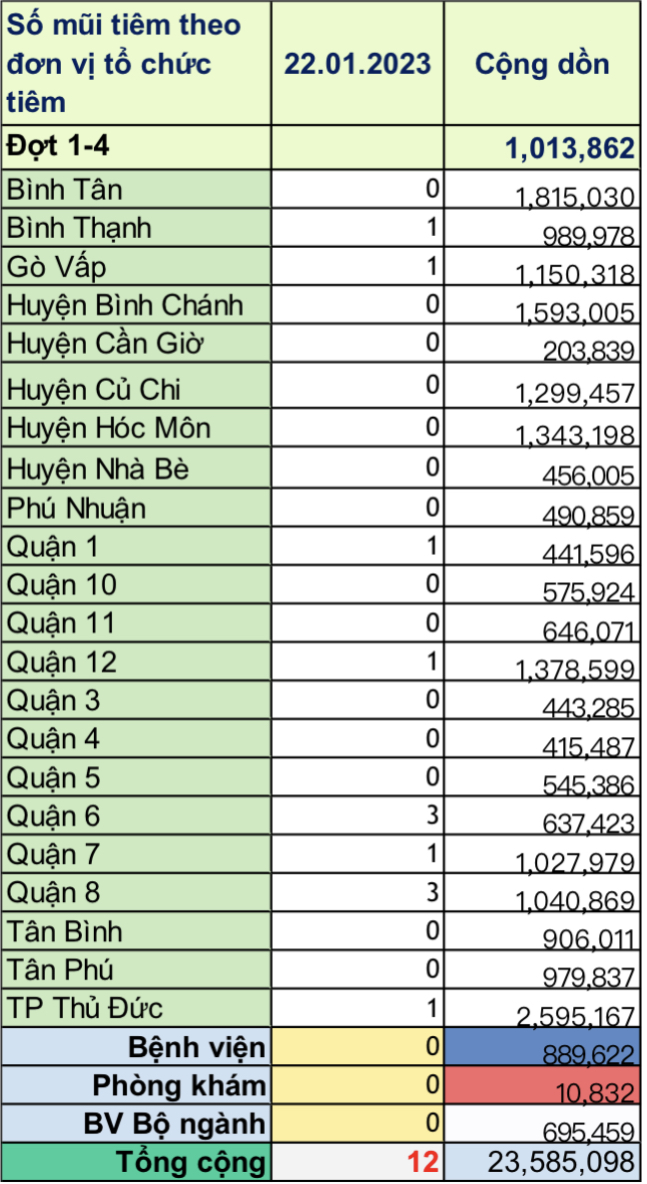 TP. Hồ Chí Minh: Cập nhật số liệu tiêm chủng vắc-xin phòng chống COVID-19 ngày 22/01/2023