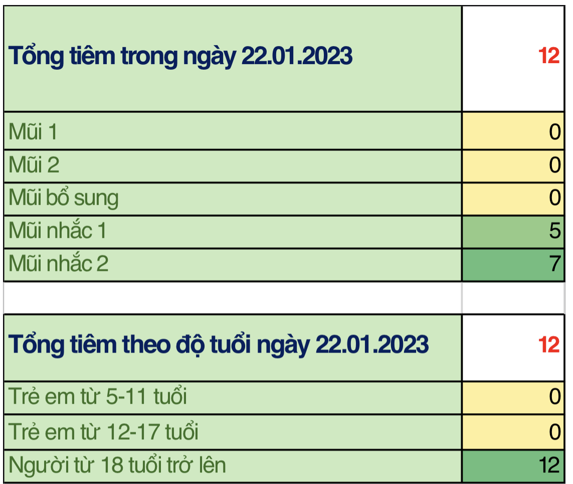 Trong ngày 22/01/2022 toàn thành phố đã tiêm được 12 mũi tiêm, bao gồm 0 mũi 1; 0 mũi 2; 0 mũi bổ sung; 5 mũi nhắc lần 1; 7 mũi nhắc lần 2 tại với 43 điểm tiêm. Trong đó: người từ 18 tuổi trở lên đã tiêm được 12 mũi (100%); trẻ từ 12 đến dưới 18 tuổi: đã tiêm được 0 mũi (0%); trẻ từ 05 đến dưới 12 tuổi: đã tiêm được 0 mũi (0%).