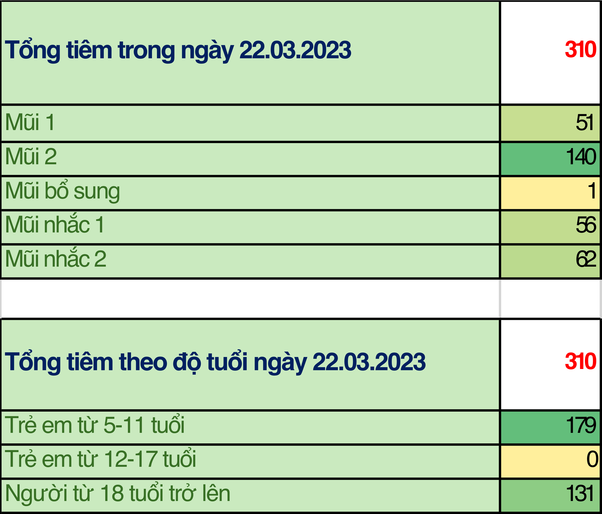 Trong ngày 22/03/2023 toàn thành phố đã tiêm được 310 mũi tiêm, bao gồm 51 mũi 1; 140 mũi 2; 1 mũi bổ sung; 56 mũi nhắc lần 1; 62 mũi nhắc lần 2 tại 86 điểm tiêm.Trong đó: người từ 18 tuổi trở lên đã tiêm được 131 mũi (42%); trẻ từ 12 đến dưới 18 tuổi: đã tiêm được 0 mũi (0%); trẻ từ 05 đến dưới 12 tuổi: đã tiêm được 179 mũi (58%).