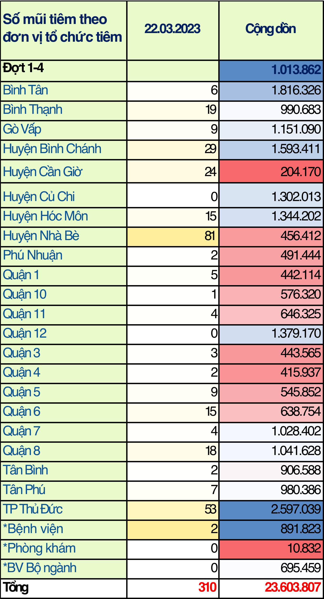 Tính đến hết ngày 22/03/2023 toàn thành phố đã tiêm được 23.603.807 mũi (bao gồm 8.703.624 mũi 1; 7.793.829 mũi 2; 683.299 mũi bổ sung; 4.846.044 mũi nhắc lần 1; 1.577.011 mũi nhắc lần 2).