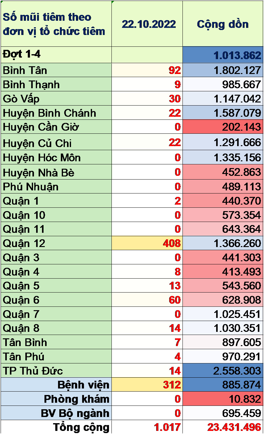 TP. Hồ Chí Minh: Cập nhật số liệu tiêm chủng vắc-xin phòng chống COVID-19 ngày 22/10/2022