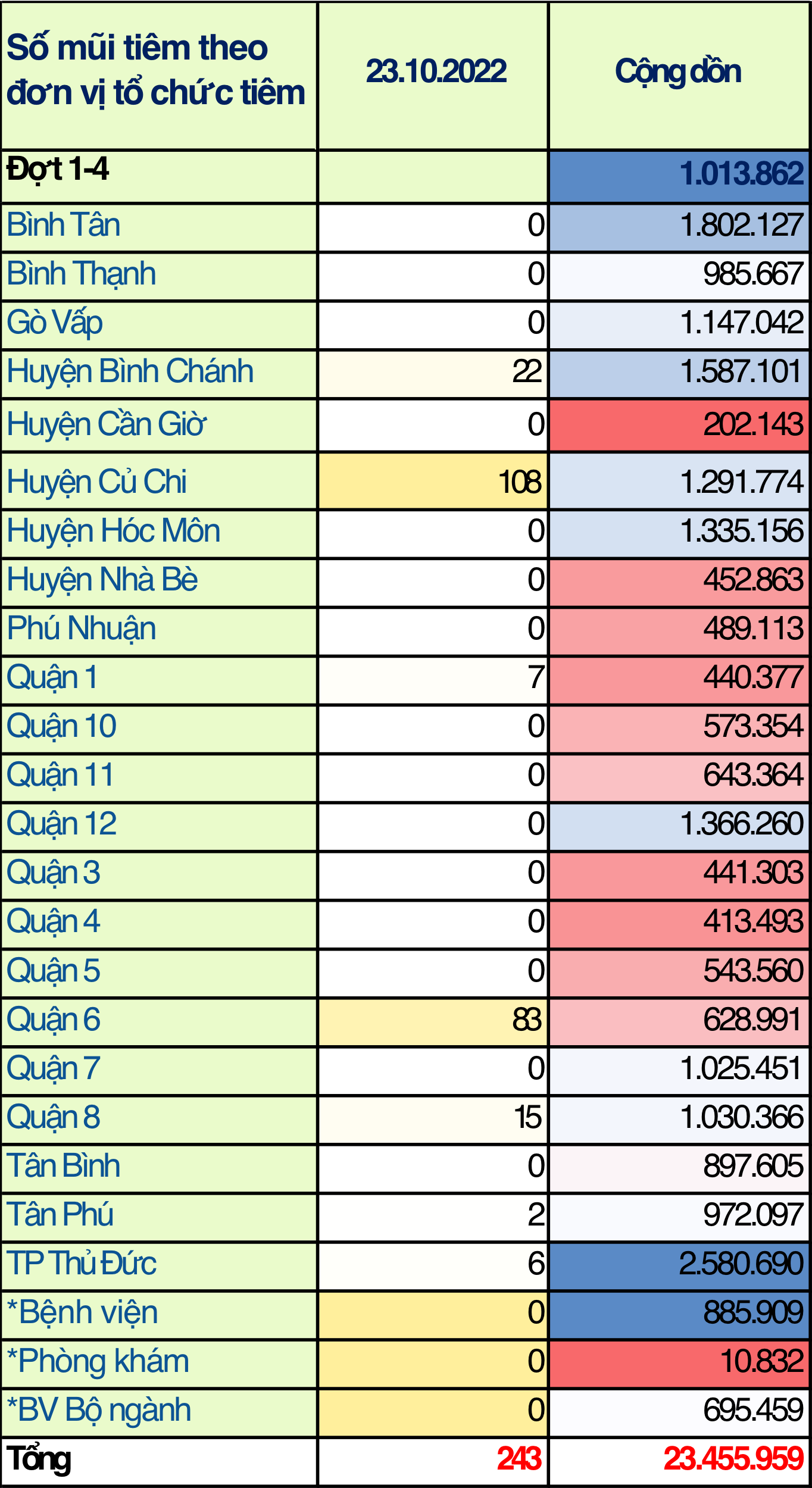 TP. Hồ Chí Minh: Cập nhật số liệu tiêm chủng vắc-xin phòng chống COVID-19 ngày 23/10/2022
