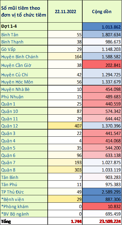 TP. Hồ Chí Minh: Cập nhật số liệu tiêm chủng vắc-xin phòng chống COVID-19 ngày 23/11/2022