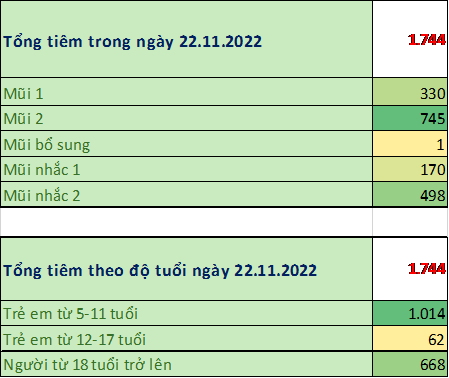 Trong ngày 23/11/2022 toàn thành phố đã tiêm được 1.744 mũi tiêm, bao gồm 330 mũi 1; 745 mũi 2; 1 mũi bổ sung; 170 mũi nhắc lần 1; 498 mũi nhắc lần 2 tại 113 điểm tiêm. Trong đó: người từ 18 tuổi trở lên đã tiêm được 668 mũi (38%); trẻ từ 12 đến dưới 18 tuổi: đã tiêm được 62 mũi (4%); trẻ từ 05 đến dưới 12 tuổi: đã tiêm được 1014 mũi (58%).