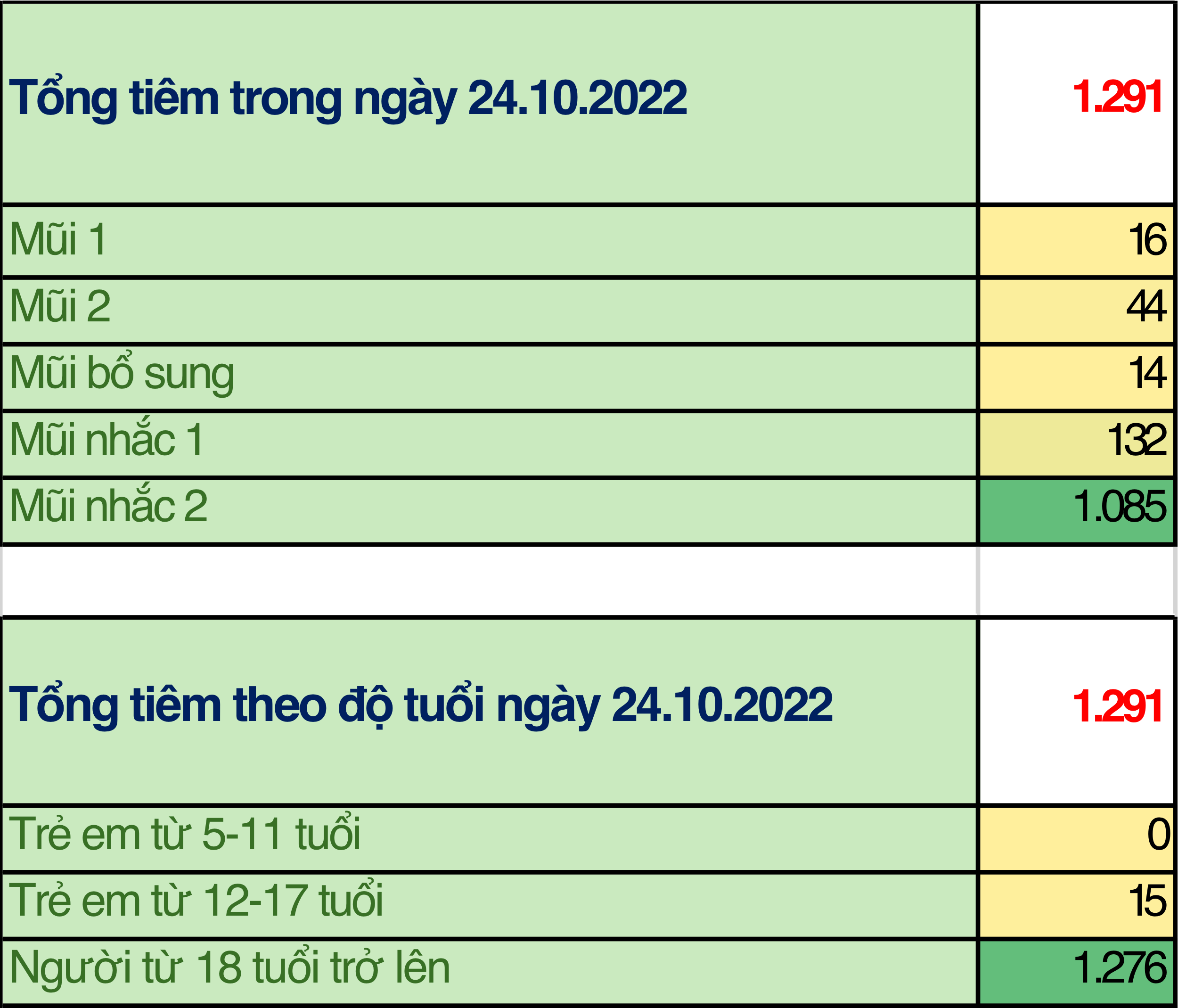 Trong ngày 24/10/2022: toàn thành phố đã tiêm được 1.291 mũi tiêm, bao gồm 16 mũi 1; 44 mũi 2; 14 mũi bổ sung; 132 mũi nhắc lần 1; 1.085 mũi nhắc lần 2 tại 62 điểm tiêm. Trong đó: người từ 18 tuổi trở lên đã tiêm được 1.276 mũi (99%); trẻ từ 12 đến dưới 18 tuổi: đã tiêm được 15 mũi (1%); trẻ từ 05 đến dưới 12 tuổi: đã tiêm được 0 mũi (0%).