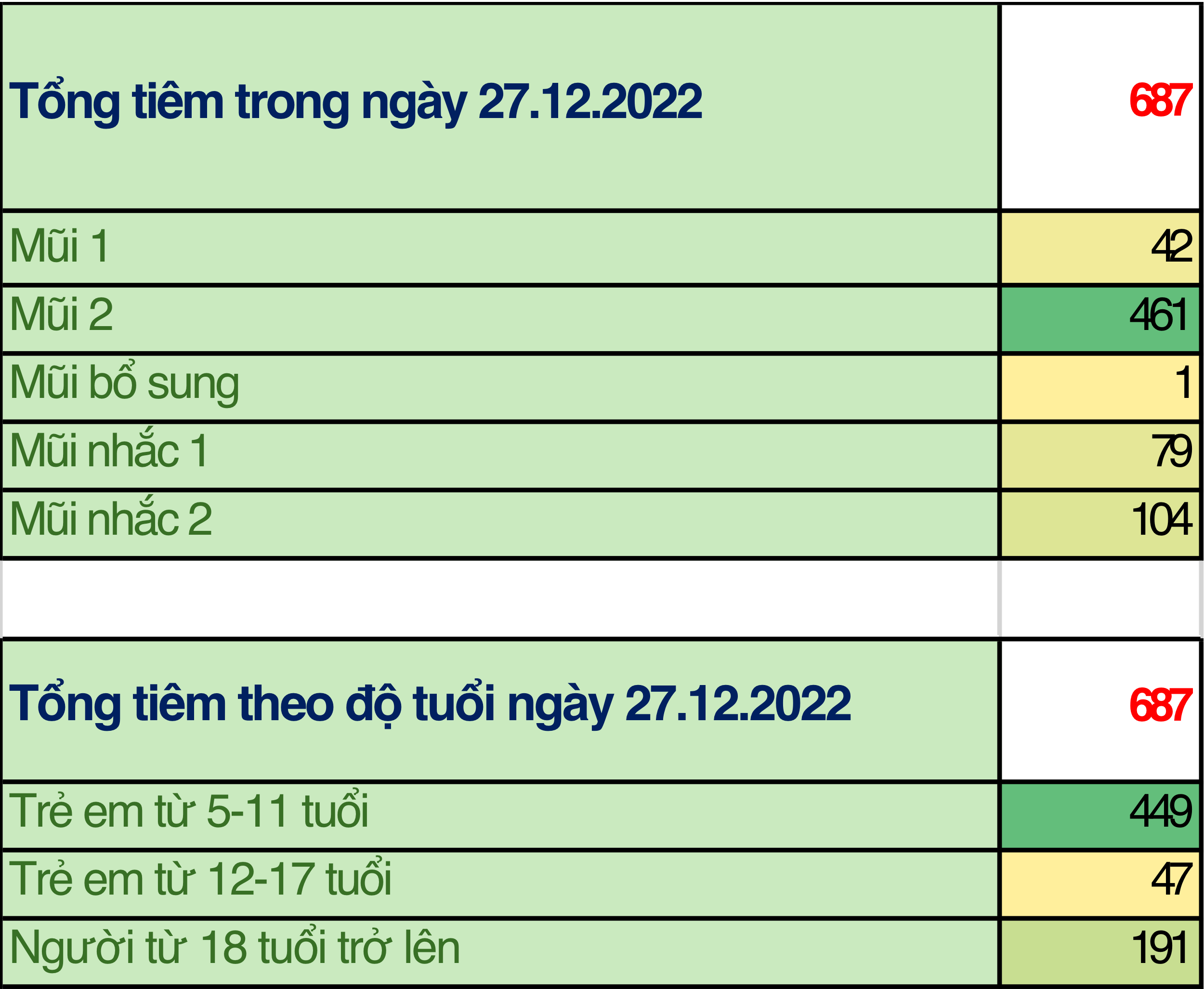 Trong ngày 27/12/2022 toàn thành phố đã tiêm được 687 mũi tiêm, bao gồm 42 mũi 1; 461 mũi 2; 1 mũi bổ sung; 79 mũi nhắc lần 1; 104 mũi nhắc lần 2 tại 34 điểm tiêm.Trong đó: người từ 18 tuổi trở lên đã tiêm được 191 mũi (28%); trẻ từ 12 đến dưới 18 tuổi: đã tiêm được 47 mũi (7%); trẻ từ 05 đến dưới 12 tuổi: đã tiêm được 449 mũi (65%).