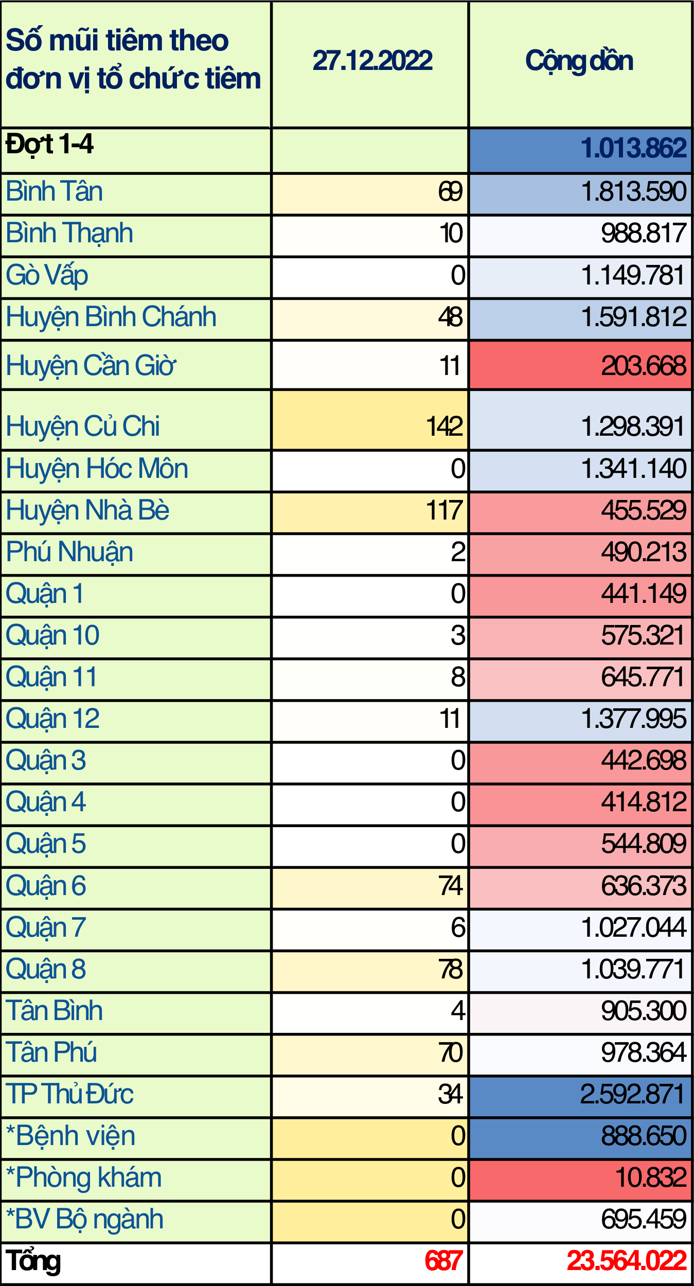 TP. Hồ Chí Minh: Cập nhật số liệu tiêm chủng vắc-xin phòng chống COVID-19 ngày 27/12/2022