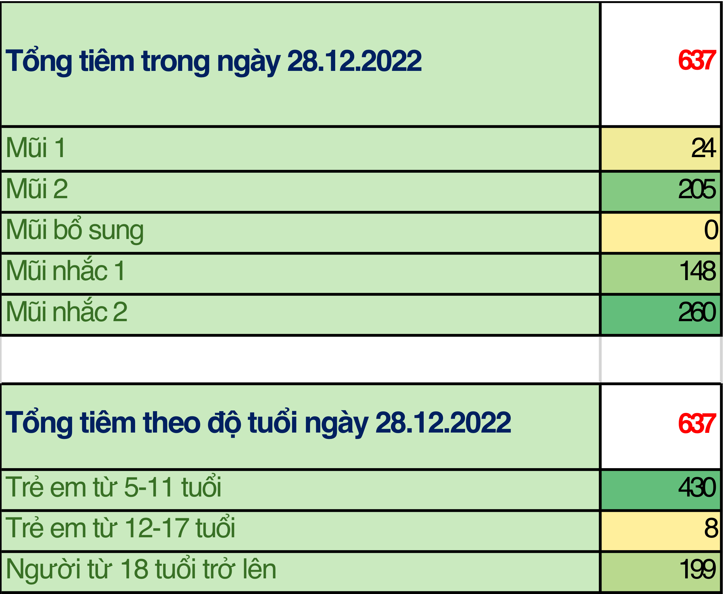Trong ngày 28/12/2022 toàn thành phố đã tiêm được 637 mũi tiêm, bao gồm 24 mũi 1; 205 mũi 2; 0 mũi bổ sung; 148 mũi nhắc lần 1; 260 mũi nhắc lần 2 tại 45 điểm tiêm.Trong đó: người từ 18 tuổi trở lên đã tiêm được mũi (31%); trẻ từ 12 đến dưới 18 tuổi: đã tiêm được 47 mũi (1%); trẻ từ 05 đến dưới 12 tuổi: đã tiêm được 449 mũi (68%).