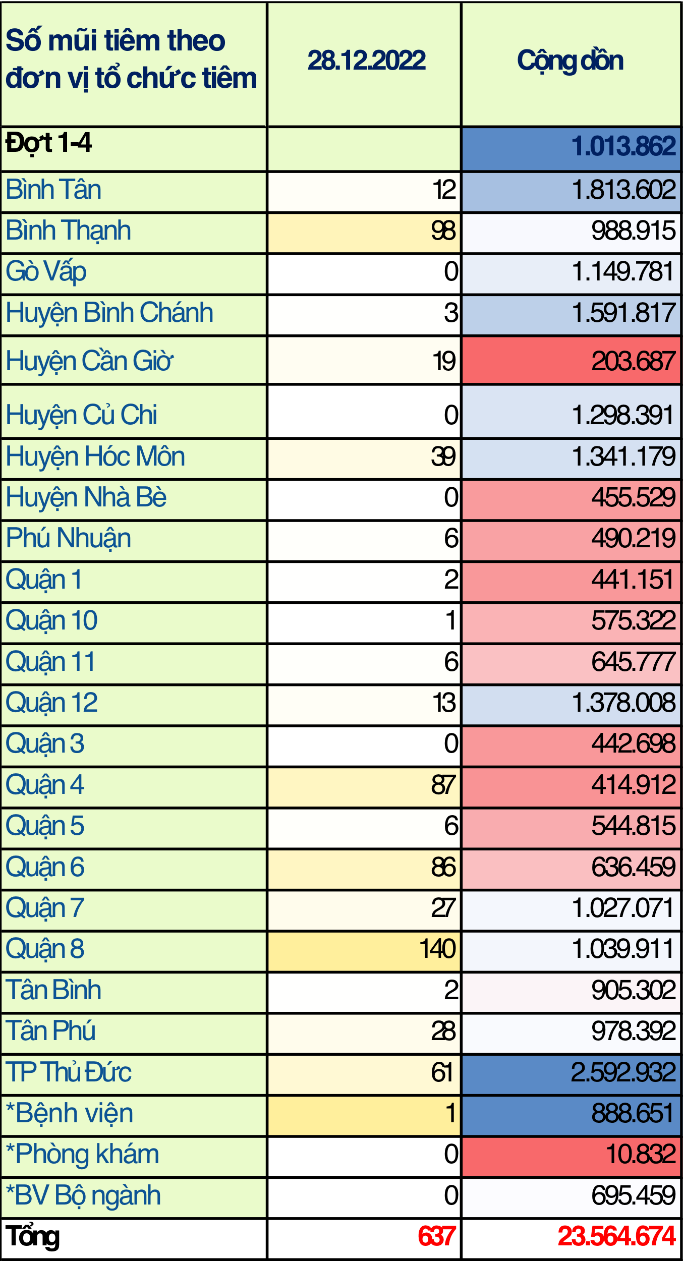 TP. Hồ Chí Minh: Cập nhật số liệu tiêm chủng vắc-xin phòng chống COVID-19 ngày 28/12/2022