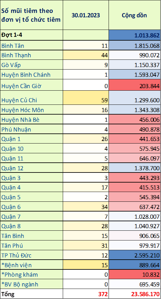 TP. Hồ Chí Minh: Cập nhật số liệu tiêm chủng vắc-xin phòng chống COVID-19 ngày 30/01/2023