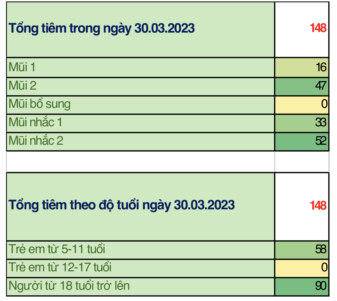 Trong ngày 30/03/2023 toàn thành phố đã tiêm được 148 mũi tiêm, bao gồm 16 mũi 1; 47 mũi 2; 0 mũi bổ sung; 33 mũi nhắc lần 1; 52 mũi nhắc lần 2 tại 126 điểm tiêm.Trong đó: người từ 18 tuổi trở lên đã tiêm được 90 mũi (61%); trẻ từ 12 đến dưới 18 tuổi: đã tiêm được 0 mũi (0%); trẻ từ 05 đến dưới 12 tuổi: đã tiêm được 58 mũi (39%).