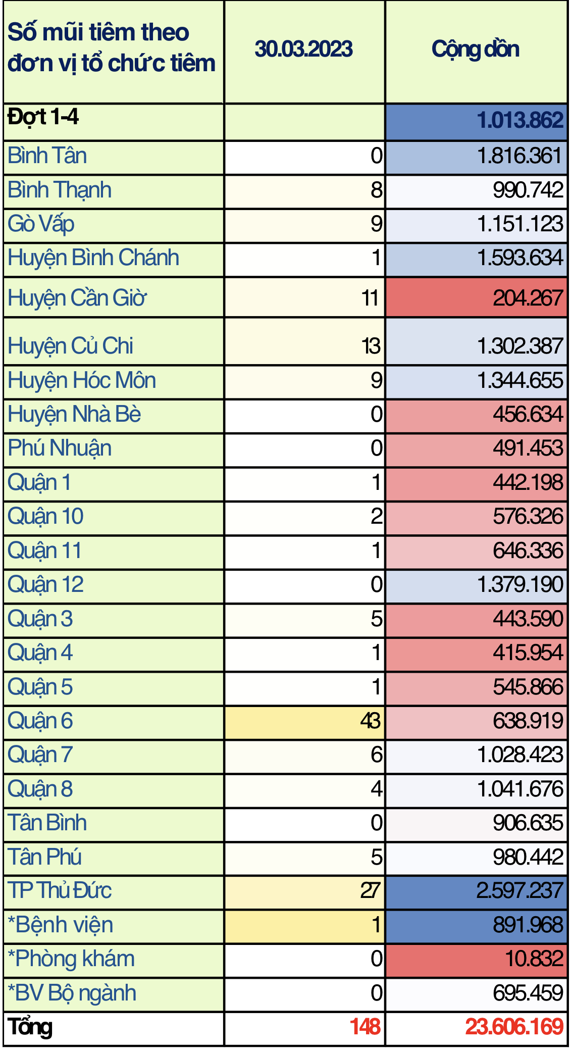 Tính đến hết ngày 30/03/2023 toàn thành phố đã tiêm được 23.606.169 mũi (bao gồm 8.704.156 mũi 1; 7.794.868 mũi 2; 683.302 mũi bổ sung; 4.846.368 mũi nhắc lần 1; 1.577.475 mũi nhắc lần 2).