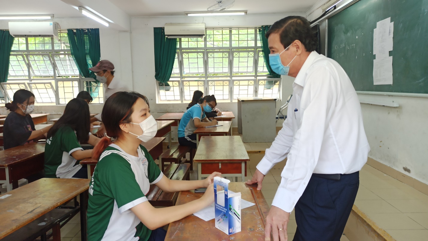 Ảnh: TS.BS Nguyễn Anh Dũng, Phó Giám đốc Sở Y tế thăm hỏi học sinh tại điểm tiêm thuộc huyện Bình Chánh