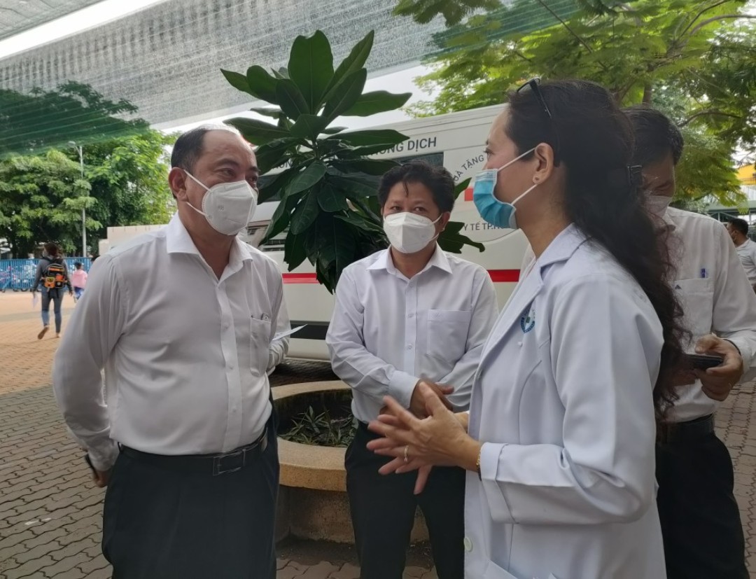 Ảnh: TS.BS. Nguyễn Văn Vĩnh Châu, Phó Giám đốc Sở Y tế TP.HCM đến thăm hỏi nhân viên y tế đang công tác tại điểm tiêm thuộc huyện Hóc Môn