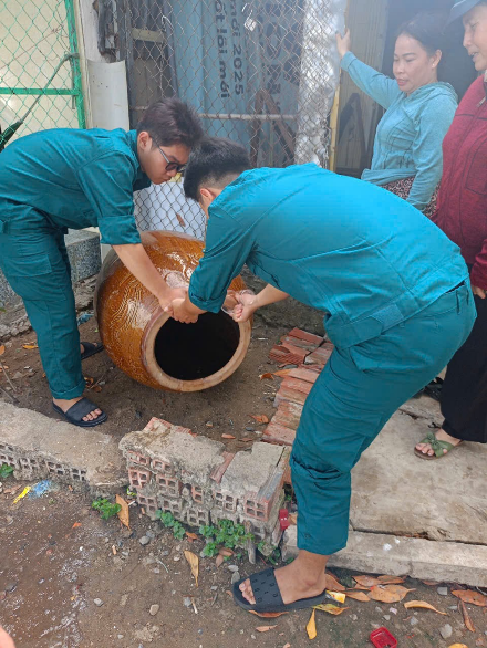 Ảnh: Giám sát điểm nguy cơ, diệt lăng quăng, hướng dẫn người dân thực hiện các biện pháp xử lý vật chứa nước và phát tờ rơi cho người dân
