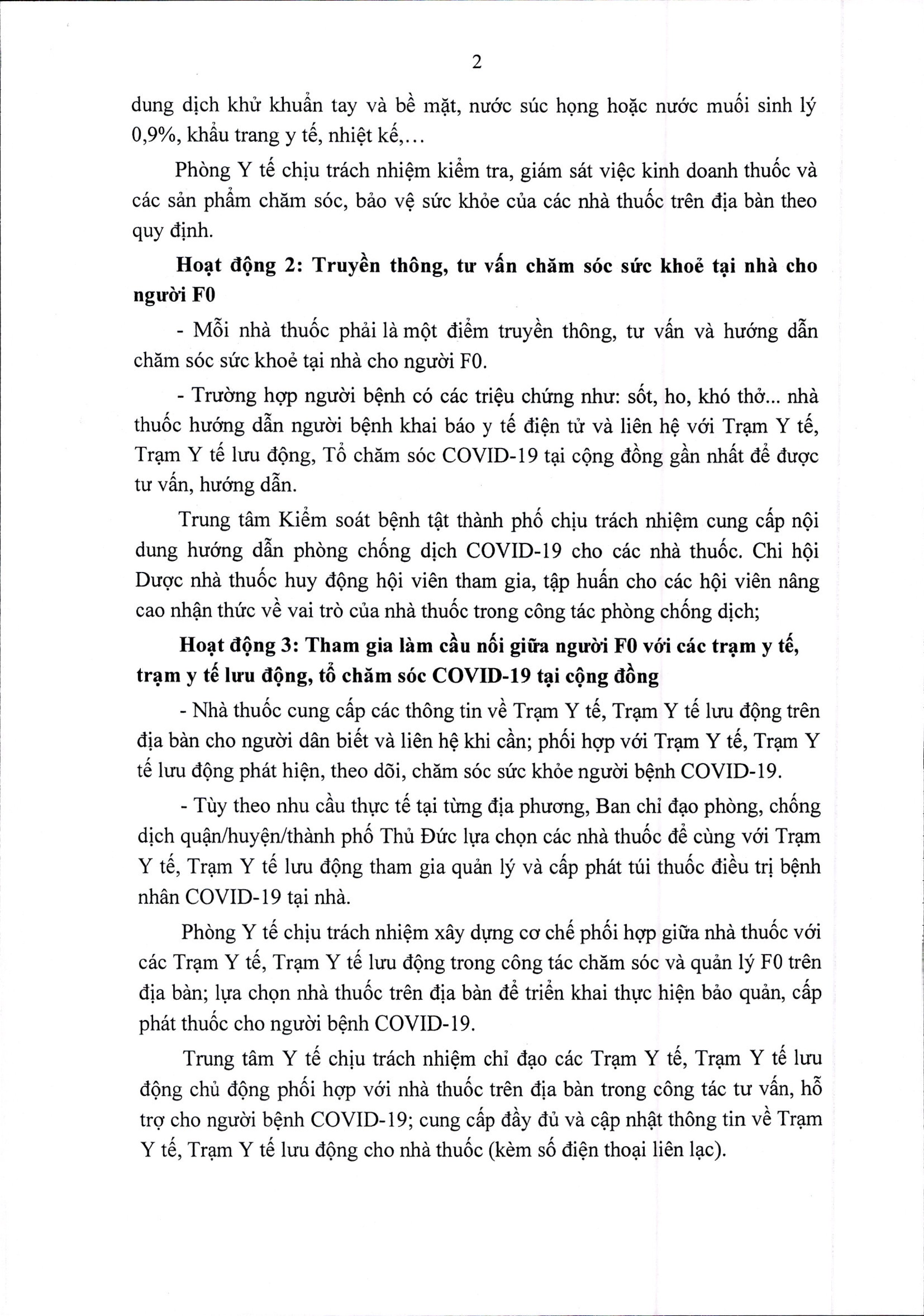 Mặt khác, mỗi nhà thuốc phải là một điểm truyền thông, tư vấn và hướng dẫn chăm sóc sức khoẻ tại nhà cho người F0. Khi phát hiện người bệnh có các triệu chứng như: sốt, ho, khó thở... nhà thuốc hướng dẫn người bệnh khai báo y tế điện tử và liên hệ với y tế gần nhất để được tư vấn, hướng dẫn. Bên cạnh đó, nhà thuốc sẽ là cầu nối giữa người F0 với các trạm y tế, trạm y tế lưu động, tổ chăm sóc COVID-19 tại cộng đồng bao gồm việc cung cấp các thông tin về y tế trên địa bàn cho người dân biết và liên hệ khi cần, phối hợp để phát hiện, theo dõi và chăm sóc sức khỏe người bệnh COVID-19. Tùy theo nhu cầu thực tế tại từng địa phương, các nhà thuốc sẽ được lựa chọn để cùng cán bộ y tế tham gia quản lý và cấp phát túi thuốc điều trị bệnh nhân COVID-19 tại nhà.