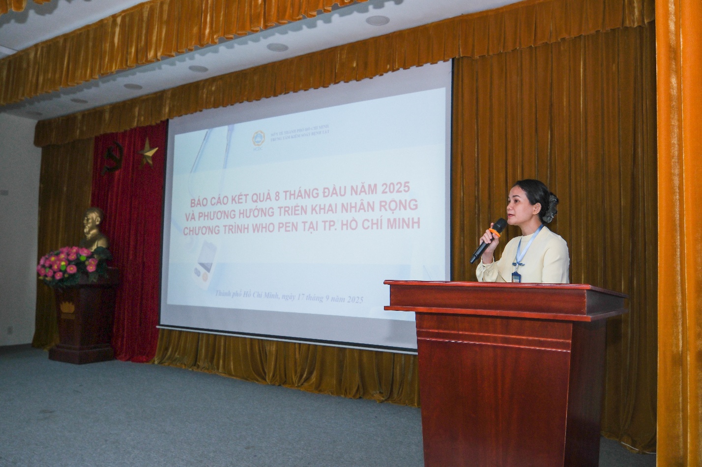 Ảnh: BS.CKI. Nguyễn Ngọc Thuỳ Dương – Phó Giám đốc HCDC trình bày nội dung Báo cáo kết quả 8 tháng đầu năm 2025 và phương hướng triển khai nhân rộng chương trình WHO PEN tại TP.HCM