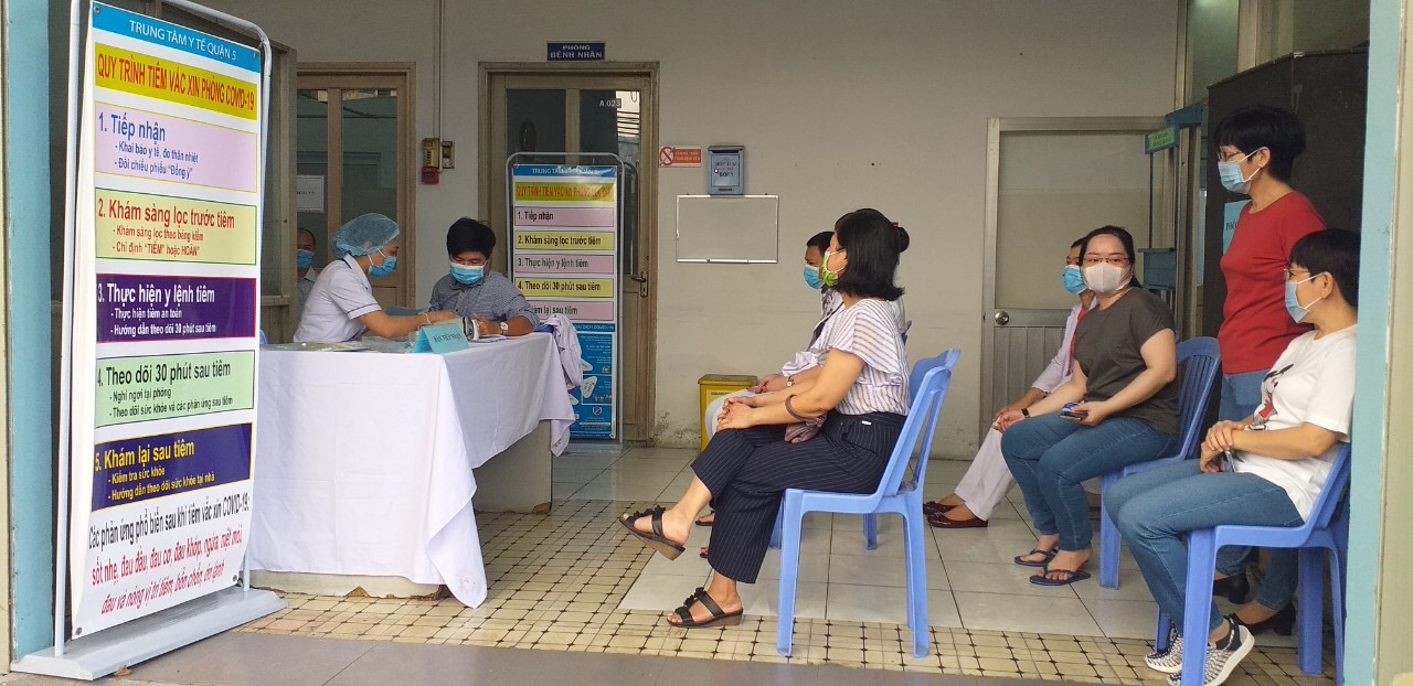 Ảnh: Tổ chức tiêm chủng vắc xin phòng COVID-19 tại Trung tâm Y tế quận 5 (nguồn: Trung tâm Y tế quận 5)